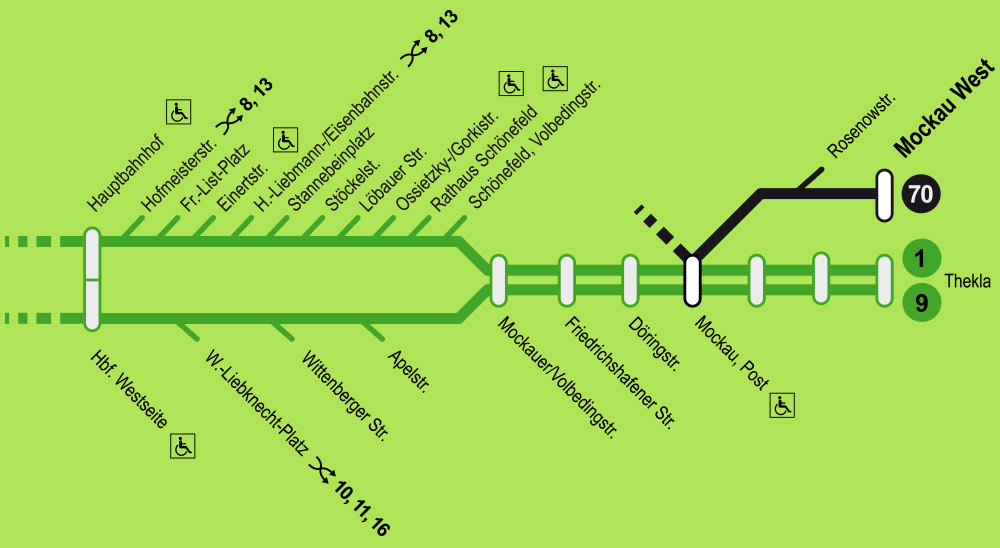 der Tram 1 oder Tram 9 (Richtung Thekla) vom Hauptbahnhof bis Mockau Post > danach weiter mit dem Bus 70 (Richtung Mockau West) > Endhaltestelle Mockau West